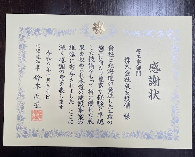 令和8年1月30日 ホテルポールスター札幌にて、建設部工事等優秀者表彰式がおこなわれました。 管工事部門で、苫小牧市道営住宅新築衛生設備工事(しらかば南団地B)が優れた成績を収めた工事と認められ、北海道より感謝状を頂きました。 これからもより一層技術の研鑽に努め、北海道の管工事事業に貢献すべく邁進してまいります。